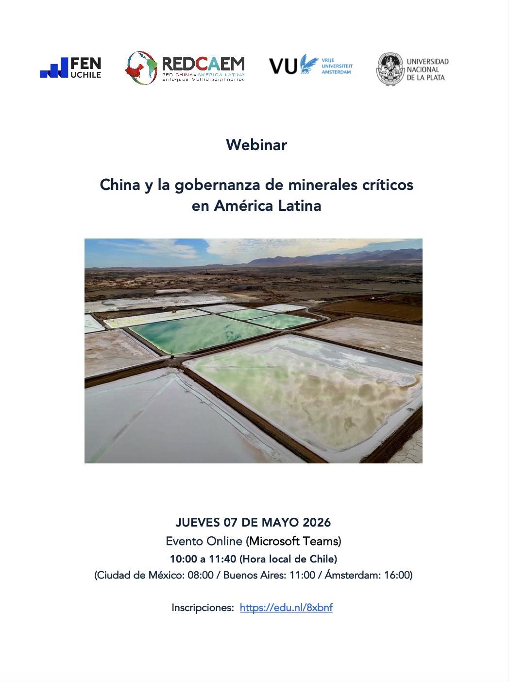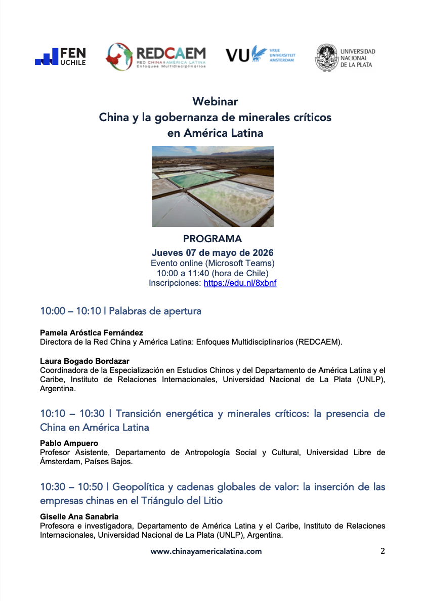 La Red China y América Latina: Enfoques Multidisciplinarios (REDCAEM), junto a la la Universidad Libre de Ámsterdam, Países Bajos; la Facultad de Economía y Negocios (FEN) de la Universidad de Chile, y la Universidad Nacional de La Plata, Argentina, tienen el el agrado de invitar a la comunidad académica y público general a participar en la Webinar China y la gobernanza de minerales críticos en América Latina.